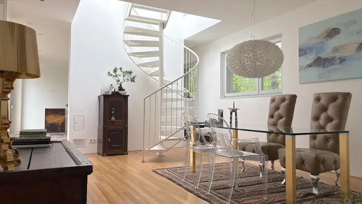 Die Raumaufteilung kurz skizziert: 2 Eingänge (Lift und Haustüre), Kochen, Essen, Wohnen, jeweils mit Zugängen zu Balkon, Terrasse, Rooftop (Wendeltreppe), Schlafzimmer, Bad, Gäste-Wc, ... perfekt für Pärchen, die das "Nicht Alltägliche" suchen. Durch die Installation einer Wand, ursprünglich so vorgesehen, wäre ein zweites Schlafzimmer jederzeit generierbar, wobei die Großzügigkeit nicht verloren geht. Aus jedem der überdurchschnittlich hohen Räume bietet sich ein wunderbarer Blick ins Grüne.