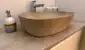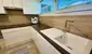 • ein helles Badezimmer mit Dusche, Waschbecken und WC,