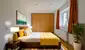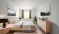 Ein ruhiger Rückzugsort in natürlichen Tönen: helle Eichenmöbel, zarte Vorhänge in Oliv- oder Sandfarben und Pflanzen sorgen für eine entspannte Atmosphäre.