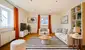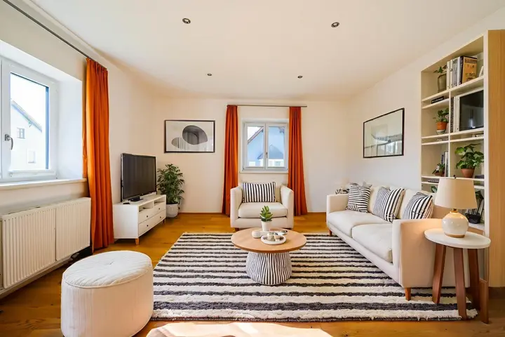 Natürliche Hölzer und helle Textilien in Kombination mit kräftigen Akzenten – etwa orangefarbene Vorhänge, ein grafisch gemusterter Teppich und schwarze-weiße Kissen – bringen Wärme und Dynamik in den Raum. Eine schlichte Bücherwand schafft Struktur und Stauraum.