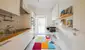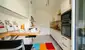 Die bestehende Küchenzeile lässt sich mit neuen Griffen, einer hellen Wandfarbe und modernen Barstühlen optisch aufwerten. Eine kleine Hängeleuchte über dem Frühstückstisch setzt einen wohnlichen Akzent.