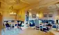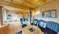 Der Wohnbereich ist mit maßgefertigten Holzmöbeln ausgestattet, darunter eine einzigartige geschwungene Bank mit blauem Bezug und gemütliche Holz Fauteuils. Künstlerische Akzente wie Wandbilder und Skulpturen mit Naturmotiven unterstreichen das alpine Ambiente. Die Küche ist zwar kompakt, aber effizient gestaltet und verfügt über elegante weiße Schränke, moderne Geräte und robuste Steinarbeitsplatten.