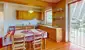 Das Herzstück der Wohnung ist ein einladender, offener Wohnbereich, der Küche und Esszimmer vereint. Die Wohnküche besticht durch warme Holzmöbel mit modernen Küchengeräten und schafft so einen funktionalen Kochbereich und zugleich ein kommunikatives Wohngefühl.