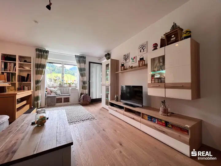 Das Herzstück der Wohnung bildet das großzügige Wohnzimmer mit einem gemütlichen Sitzfenster und direktem Zugang zur Loggia. Diese bietet zusätzlichen Freiraum zum Entspannen oder für gesellige Stunden im Freien.