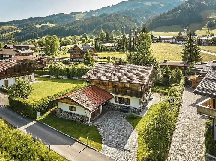 Inmitten der malerischen Landschaft des idyllischen Ortes Aschau bei Kirchberg, umgeben von der sanften Kulisse eines romantischen Bachlaufs, präsentiert sich dieses exklusive Chalet im traditionellen Tiroler Stil. Das im Jahr 2007 mit viel Liebe zum Detail errichtete Landhaus besticht durch seine harmonische Verbindung von traditioneller Handwerkskunst und zeitloser Eleganz. Schon beim Betreten des Erdgeschosses eröffnet sich ein wohnliches Ambiente: Der offen gestaltete Wohn-/Essbereich aus Zirbenholz und Altholz wird durch eine originale Tiroler Stube ergänzt. Ein traditioneller Kachelofen sorgt für behagliche Wärme. Von der hochwertigen Bulthaup-Küche mit Altholzelementen aus gelangt man direkt in den liebevoll angelegten Garten, sowie auf die großzügige Sonnenterrasse. Das Obergeschoss beherbergt den privaten Rückzugsbereich: Ein großzügiger Masterbereich mit eigenem Badezimmer sowie zwei weitere Schlafzimmer, jeweils mit eigenem Bad, bieten höchsten Wohnkomfort. Im Untergeschoss entfaltet sich ein stilvoll eingerichteter Wellnessbereich mit Zirben-Sauna, Dusche und Whirlpoolwanne lädt zum Entspannen ein. Darüber hinaus stehen ein Technikraum, ein Wirtschaftsraum und ein kleiner Lagerraum zur Verfügung, die praktische Funktionalität mit Komfort verbinden. Abgerundet wird das Angebot durch eine große Garage mit Platz für ein Fahrzeug sowie zusätzlichen Stauraum und vier Außenstellplätze.