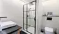 Das Badezimmer ist mit einer Dusche, einer Toilette sowie mit modernen Bademöbeln ausgestattet.
