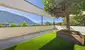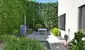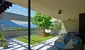 Besonderes Highlight ist die rund 100 m² große Terrasse im Obergeschoss, in die eine begrünte Fläche integriert wurde. Die fast 50 cm starke Humusschicht ermöglicht die Anlage einer Rasenfläche sowie die Pflanzung eines Amberbaums in einem Pflanzgefäß aus Cortenstahl. Die Terrasse ist teilweise verglast und dadurch windgeschützt. Die umlaufende Kubus-Architektur rahmt die Panoramasicht auf die umliegende Bergwelt wie ein Bild ein. Großflächige Hebeschiebetüren verbinden Wohnbereich, Küche und Terrasse nahtlos miteinander.