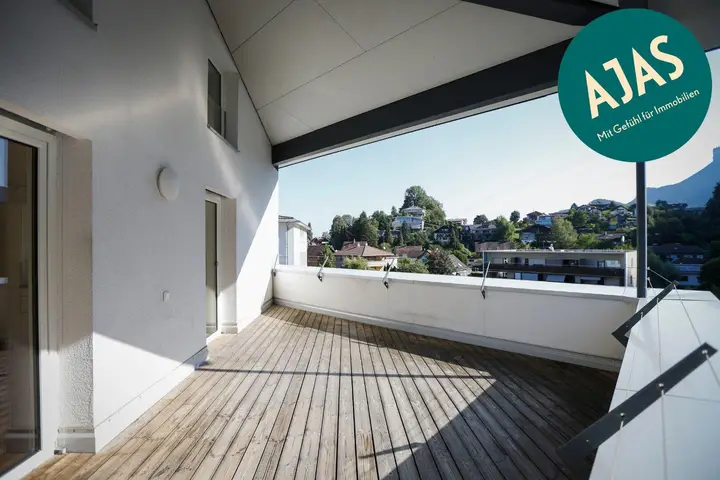 Der mit 53 m² sehr großzügige Wohn-Ess-Bereich samt Küche ist das Herz dieser Wohnung. Weiters hat die Terrasse (ca.18,83 m²) mit ihrem Ausblick vom Götzner Wahrzeichen "Ruine Montfort" bis zu den Schweizer Bergen und ihrer über 4 m hohen Decke einen besonderen Flair.