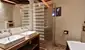 Das moderne Badezimmer mit Doppelwaschbecken, Dusche, Badewanne und Handtuchtrockner befindet sich im vorderen Teil der Suite. Der Boden des Badezimmers