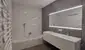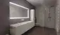 Die gesamte Wohnung ist mit hochwertigen Fliesen ausgestattet. Das großzügige Bad wirkt durch die Kombination von hellen und dunklen Fliesen sehr edel. Das Badezimmer verfügt über ein Doppelwaschbecken, eine Badewanne, eine begehbare Dusche und ein WC. Genügend Stauraum durch eingebaute Badschränke ist gegeben. Ein separates WC und ein praktischer Abstellraum sind ebenfalls vorhanden.