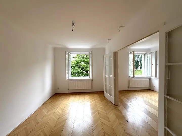 Wiener Kastenfenster, klassische Holztüren und ein eleganter Fischgrätparkettboden verleihen der Wohnung einen stilvollen Charakter. Fliesen in Bad und WC sowie eine Diele in der Wohnküche ergänzen das Bild.