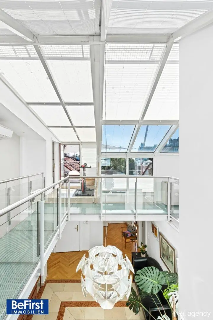 Diese sehr schicke und architektonisch toll gestaltete Dachterrassenwohnung in phantastischer Lage zwischen der Votivkirche und dem Servitenviertel gelegen, besticht neben der modernen und offenen Raumaufteilung allen voran durch zwei ruhig gelegene, herrliche Terrassen. Die Immobilie mit rd. 181m2 Wohnnutzfläche (inkl. 22,25m2 Galerie) wurde hochwertigst in einem der zauberhaften Gründerzeithäuser am Beginn der Berggasse errichtet. Die Wohnfläche teilt sich in eine erste Ebene mit großzügigem Entree, dem wunderschönen Wohnbereich, einer separaten, lichtdurchfluteten Küche und dem Schlafzimmer mit einem angeschlossenen Badezimmer sowie der in einen hübschen, sonnendurchfluteten Innenhof ausgerichteten rd.16m2 großen Terrasse. Eine Garderobe, ein weitere Abstell- und Wirtschaftsraum etc. zählen zudem zu der perfekt gestalteten Immobilie und geben ausreichend Stauraum. Die Decke im Eingangsbereich reicht durchgehend bis ins Obergeschoss und bietet damit in beiden Ebenen viel Licht und Helligkeit. Auch im OG zeigt sich die harmonische Planung. Eine nach beiden Seiten offene, verglaste Galerie dient als verbindendes Element zu einem Kinder-/Gästezimmer, einem Arbeitsbereich und einem weiteren Bad mit Dusche/WC sowie der herrlichen 20m2 großen zweiten Terrasse, die ebenfalls in den Innenhof ausgerichtet ist. Beheizt wird über Fußbodenheizung und Radiatoren mit Gas oder über den wunderschönen, offenen Kamin im Wohnbereich. Alle Veluxfenster verfügen über Innen- und Außenbeschattung. Die Kühlung erfolgt über Klimageräte.