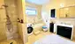 Die geräumige Küche ist mit allen notwendigen Elektroeinbaugeräten ausgestattet.