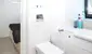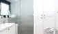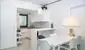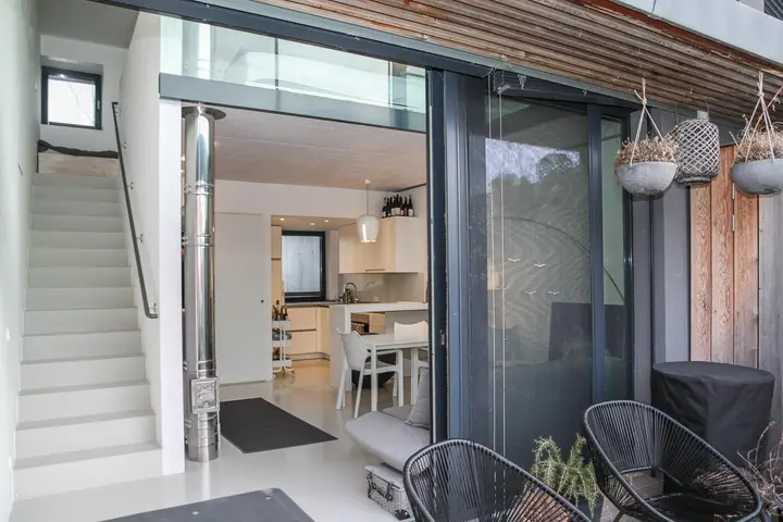 Über eine Treppe gelangt man ins Obergeschoss. Dieses verfügt über ein weiteres Bad mit Fenster, Dusche und WC, der offene Schlafbereich hat direkten Blick aufs Wasser.