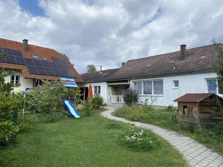 1 schönes Einfamilienhaus, BJ. 2002, 1 ehemaliges Bauernhaus mit Nebengebäuden , eine dazu gebaute Werkstatt oder Lagerhalle , eine Garage und viel Gartenfläche mit Obstbäumen.