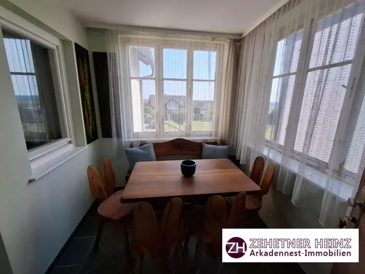 Dieses Gebäude in Aussichtslage bietet einen traumhaften Blick ins Grüne. Es wurde in den 1970 Jahren erbaut und umfasst ca. 60 m² Wohnfläche, aufgeteilt auf: Vorraum, Esszimmer, eingerichteter Küche, Wohn-Schlafzimmer, Bad mit Wanne/Duschvorrichtung sowie WC. Außerdem gibt es noch eine große Terrasse. Im Keller befinden sich der Technikraum mit Werkstätte und ein Abstellraum sowie eine Garage mit Zufahrtstor zur Straße.