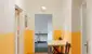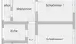 Die Wohnung liegt im ersten Stock (mit Lift). Links vom Vorraum erreicht man das Bad (mit Wanne) und die Küche (mit Abstellkammer), rechts gelangt man in das erste Zimmer und am Ende des Vorraums in das Zimmer mit Balkon. Zwei der drei Zimmer sind über den Vorraum erreichbar, ein Durchgangszimmer (mit französischem Balkon).