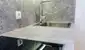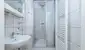 Badezimmer mit Dusche, Waschbecken, Spiegelschrank und Handtuchwärmer – hell und modern gestaltet