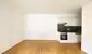 Die Küche umfasst einen Kühlschrank mit integriertem Gefrierfach, einen Geschirrspüler, einen Einbauherd mit einer Edelstahl Kochmulde sowie einen Umluft-Dunstabzug.