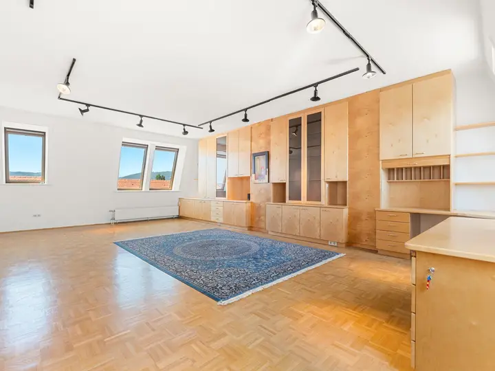 Sie befindet sich im obersten Stockwerk eines gepflegten, sechsgeschossigen Wohnhauses mit Lift. Alle Räume sind bequem vom zentralen Flur aus begehbar. Die Wohnung bietet Ausblicke in zwei Himmelsrichtungen: Straßenseitig genießt man den Blick auf die bewaldeten Hügel im Westen von Graz, hofseitig auf hohe Bäume entlang der Mur und des Augartenparks. In der kalten Jahreszeit eröffnet sich von der Terrasse aus – zugänglich über die Küche – sogar ein Blick bis zum Schlossberg.