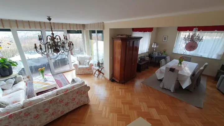 Auf rund 180 m² Wohnfläche bietet es ein großzügiges Raumkonzept: ein heller Wohn- und Essbereich mit Zugang zur Terrasse, gemütlicher Wintergarten, mehrere Schlafzimmer sowie ein modernes Badezimmer. Ein wohnlich ausgebauter Keller schafft zusätzlichen Platz für Hobbys oder Gäste.