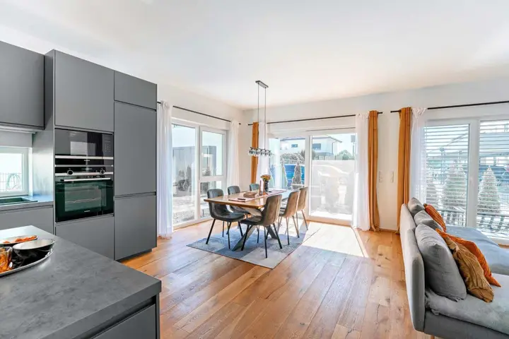 Die Ausstattung ist hochwertig und geschmackvoll gewählt: Eichenparkettböden, elegante Fliesen sowie moderne Badezimmer mit Dusche und Badewanne sorgen für Wohnkomfort auf hohem Niveau. Herzstück des Hauses ist die elegante, funktionale anthrazitfarbene Einbauküche, die durch eine angrenzende Speisekammer/Abstellraum praktisch ergänzt wird.