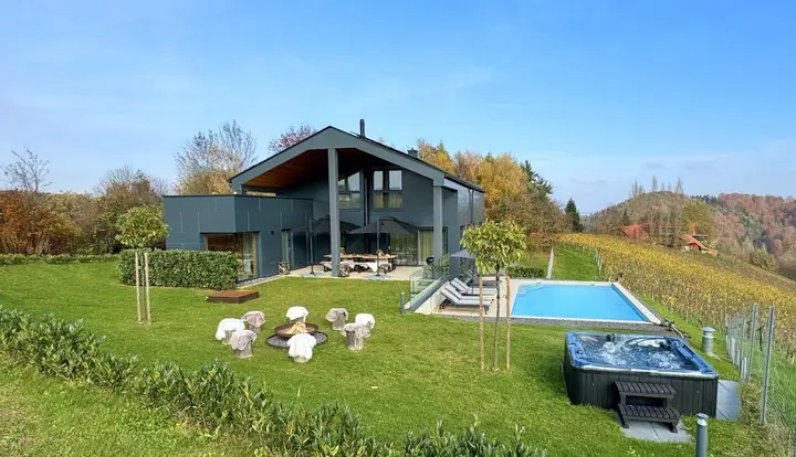 Auf einer Wohn- Nutzfläche von ca. 283m2, wurden neben den hochwertigen Materialien viele besondere Details, für außergewöhnliche Annehmlichkeiten verbaut. Im Erdgeschoss finden Sie 2 Schlafzimmer mit integrietem Badezimmer, einen großzügigen Eingangsbereich sowie einen gemütlichen Wohn-Ess- Küchenbereich mit offenem Kamin. Von dem Wohnbereich gelangen Sie direkt auf die traumhafte Terrasse mit Blick in die südsteirischen Weinberge. Im Obergeschoss finden Sie 2 weitere Schlaf- bzw. Gästezimmer, ebenfalls mit integrietem Badezimmer und ein WC. Im Untergeschoss ist die Technik und Heizung (Pellets, PV-Anlage mit 10kWp, Luftwärmepumpe) alles am neuesten Stand untergebracht. An trüben Tagen finden Sie Entspannung, im hauseigenen Weinkeller, im Heimkino oder auch in der Panorama Sauna mit beheizbarem Whirlpool. An sonnigen Tagen genießen Sie die traumhafte Poolanlage. In nur wenigen Minuten sind Sie mit dem Auto oder mit dem Fahrrad im Ortskern der Weinbaugemeinde Gamlitz oder an einem der unzähligen Buschenschänken. Für genaue Information stehen wir Ihnen nach einer schriftlichen Anfrage mit Ihren persönlichen Daten gerne zur Verfügung