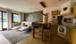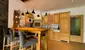 Der großzügige Wohnbereich mit einem gesetzten Kachelofen ist der Inbegriff von Gemütlichkeit und schenkt dank ausladender Glasflächen einen Blick ins Grüne. Angeschlossen an diesem Wohlfühlort befindet sich die Landhausküche mit Essplatz.