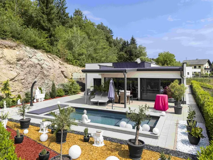 Ein besonderes Highlight bildet die ca. 120 m² große Terrasse mit Blick ins Grüne – der ideale Ort für entspannte Stunden im Freien. Der gepflegte Garten ist ebenso wie der luxuriöse Swimmingpool und die hauseigene Sauna darauf ausgelegt, höchste Lebensqualität im eigenen Zuhause zu ermöglichen.