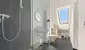 Ein architektonisches Highlight ist die moderne Design-Treppe, die den Wohnraum mit der oberen Etage verbindet. Dort eröffnet sich eine Galerie mit Glasgeländer. Angeschlossen liegt das Hauptschlafzimmer, das über ein privates Bad en-suite mit Dusche, Toilette und Fenster verfügt – ein eleganter Rückzugsort mit viel Privatsphäre.