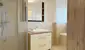 Das Badezimmer ist mit rund 7,8 m² großzügig bemessen, verfügt über eine Dusche, einen Waschtisch, einen Waschmaschinenanschluss sowie ein Fenster nach Osten, das für angenehmes Tageslicht und gute Belüftung sorgt. Zusätzlich steht ein separates WC zur Verfügung.